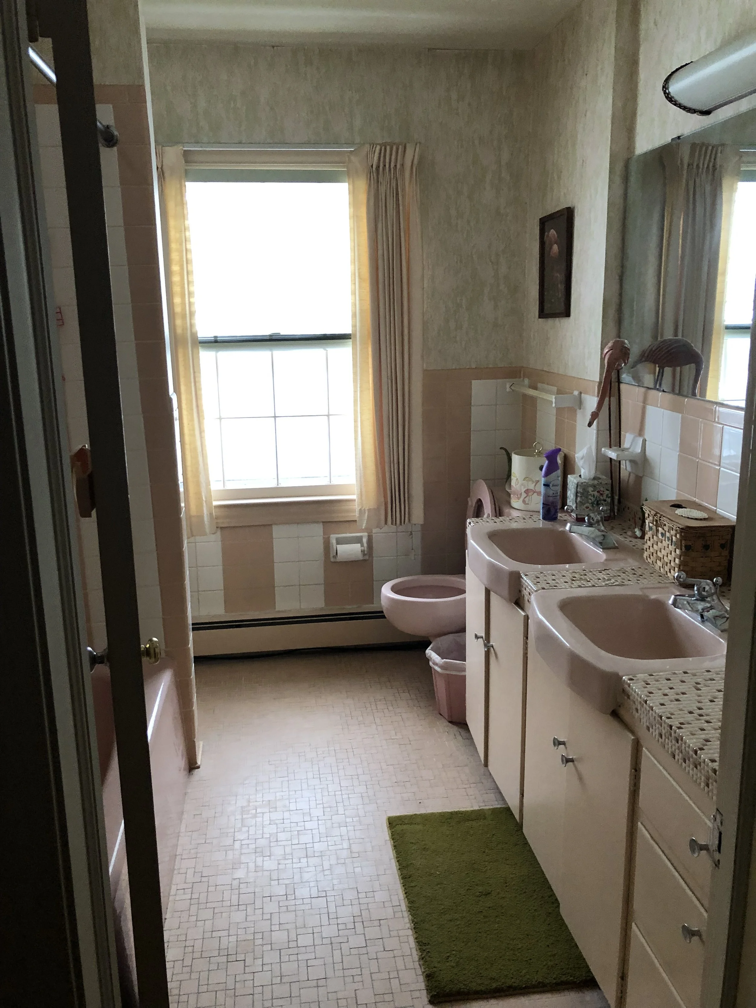 We saved the cast iron tub that would have been difficult to remove and had it resurfaced white. (Search tub resurfacing to find someone to do this locally)