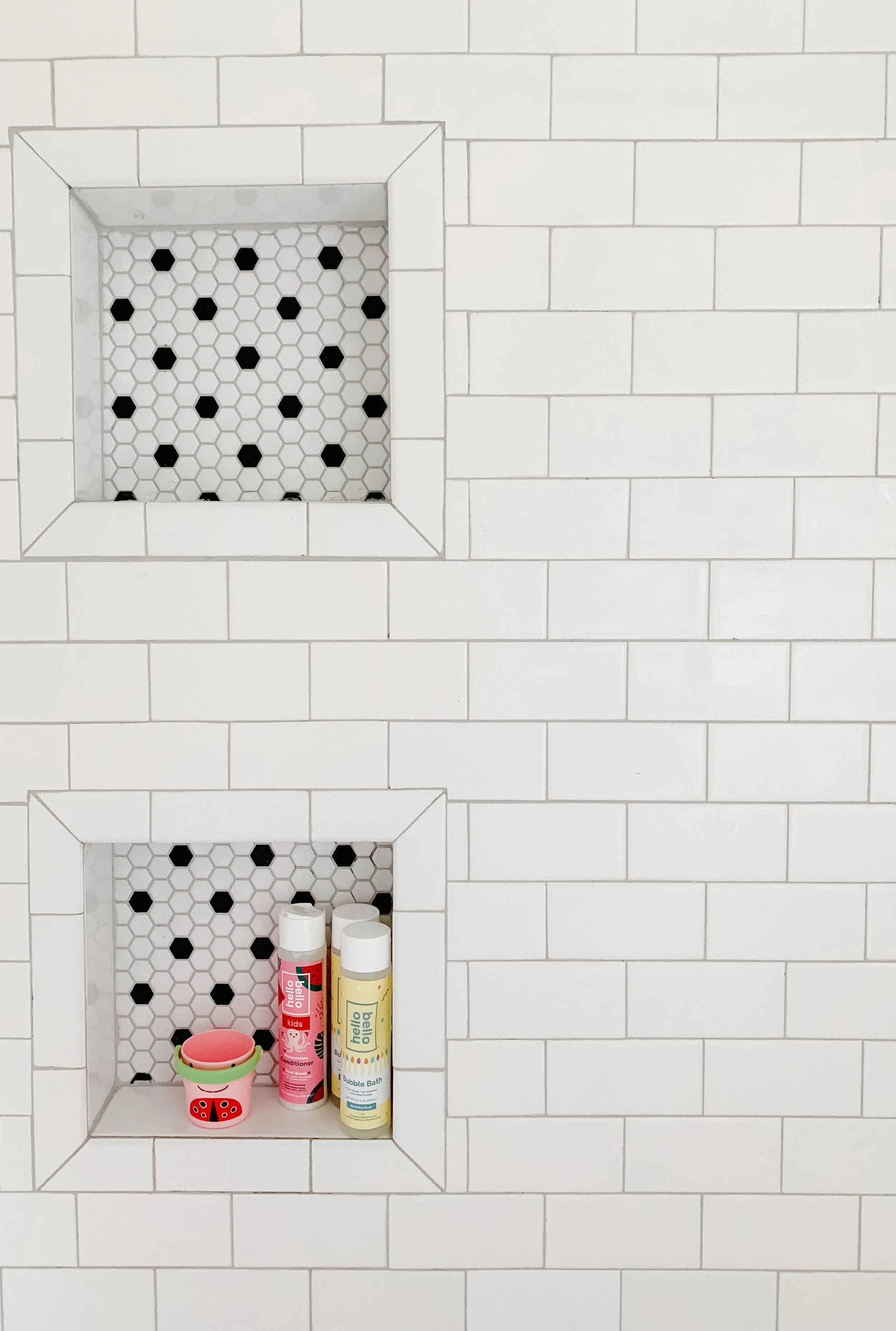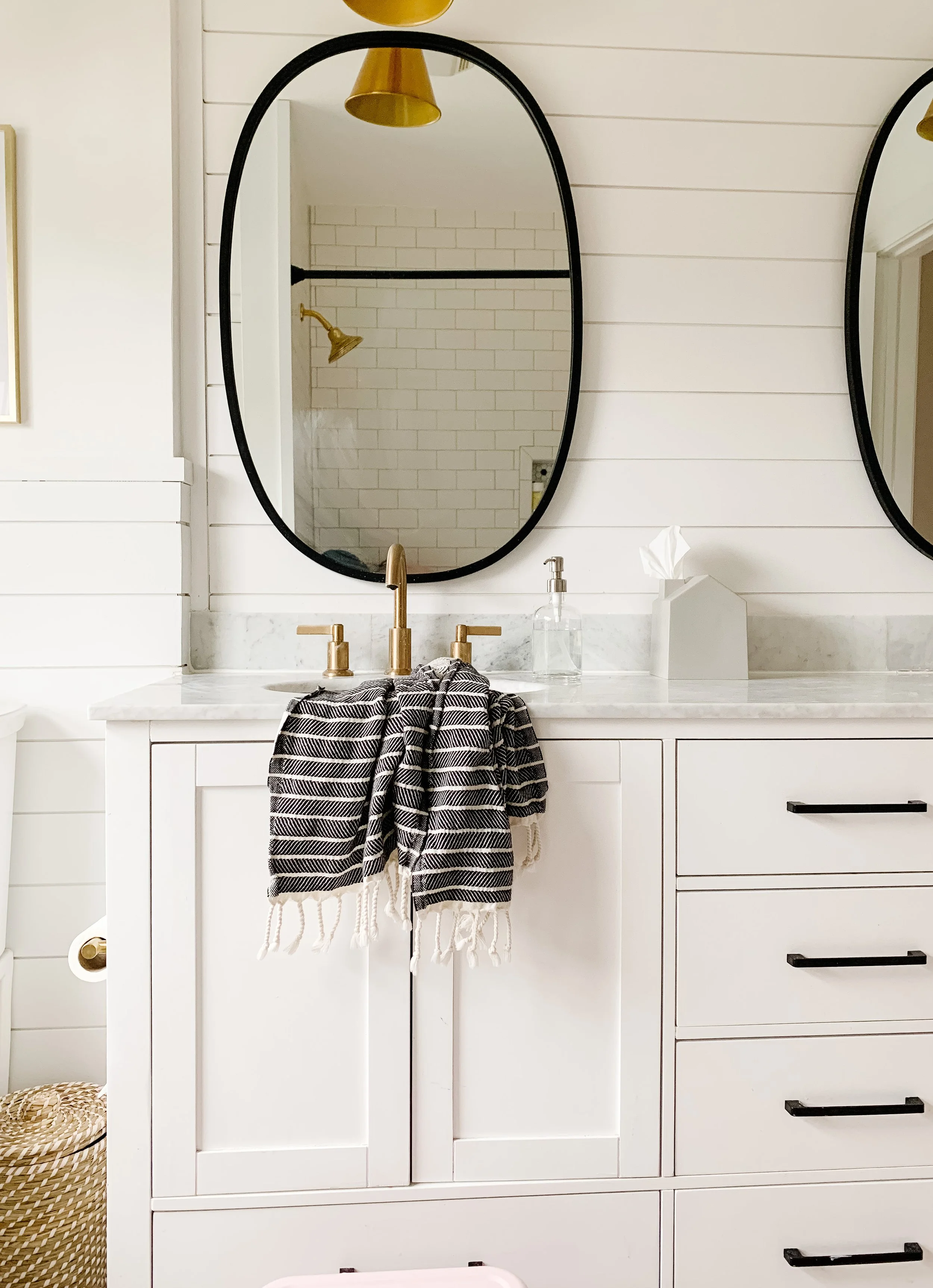 I knew I wanted some gold in the room, but they couldn’t run right up against one another. None of the golds are an exact match and I didn’t want to draw attention to that. We looked at gold mirrors and they wouldn’t have worked with gold faucets and gold sconces. Visually I needed something to break it up which is why we went with these Umbra Mirrors. ( I also love this one if I were to redo the space - linked here!)