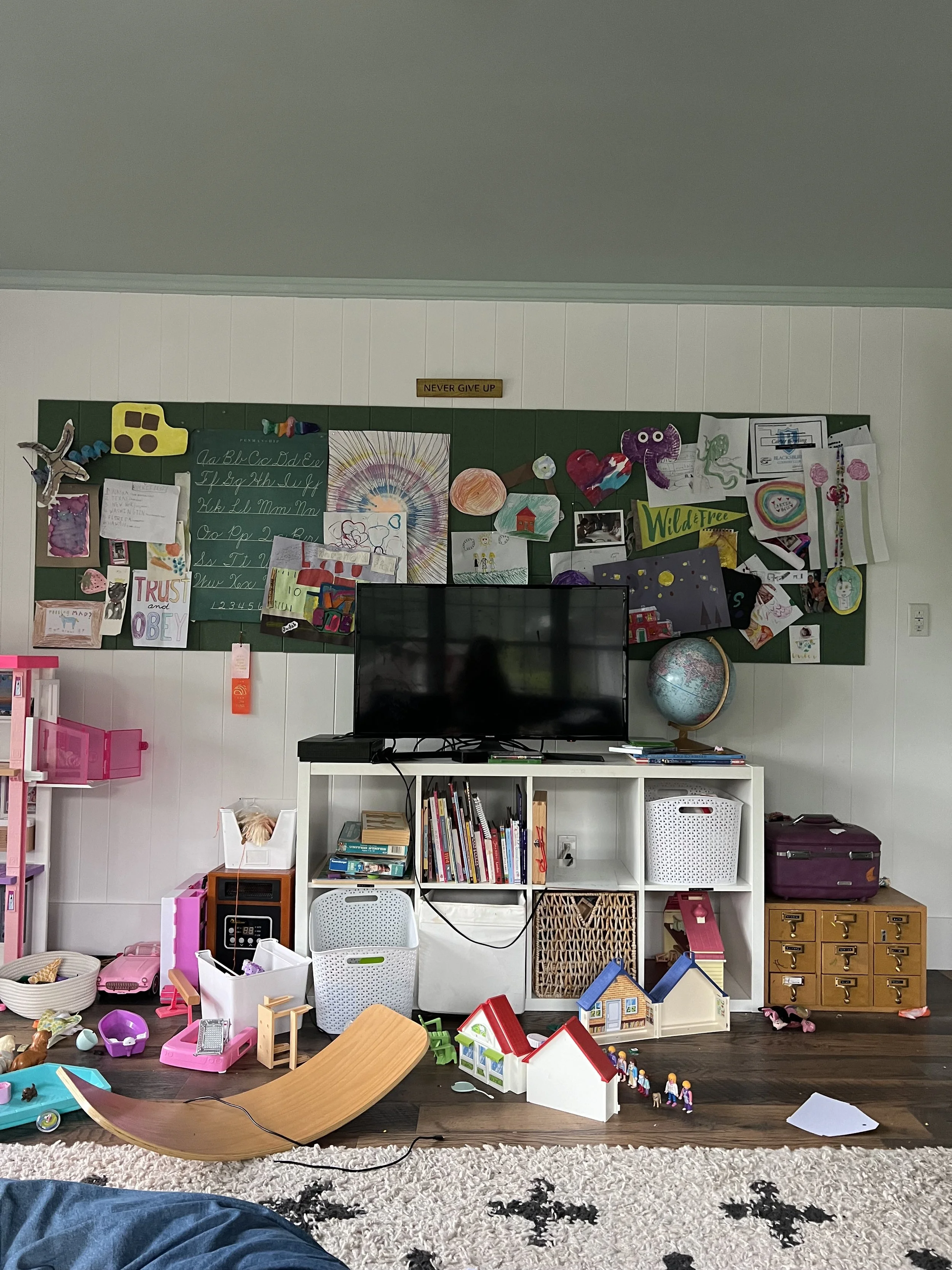 We have done a lot of work on our kids’ playroom over the past few years, but storage was one element that was really lacking. We have had this old cube for years. I was looking for something that we could close the doors to and was cute!
